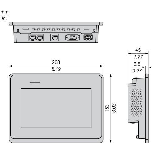 Schneider HMIST6400 Colour TFT LCD 16 million colours 800 x 480 pixels WVGA 24 V DC +/- 20 % External supply Modbus, Uni-TE, Third party protocols 1 COM1 serial link - 1 SUB-D 9-pin female - RS232C 2400-115200 bpsbottom, 1 COM2 serial link - female RJ45 - RS485 2400-115200 bpsbac