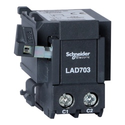 Contactor auxiliary contact blocks are used in a relay logic circuit typically switching 120 Volt AC power, instead of the motor voltage. A contactor is a relay that is used to switch a large amount of electrical power through its contacts. Contactors usually have multiple contacts that are normally-open, so that power to the load is shut off when the coil is de-energized. The most common industrial use for contactors is the control of electric motors.
