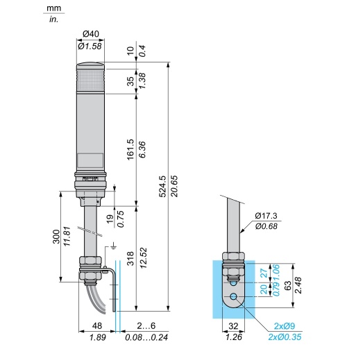 It is supplied pre-assembled and pre-cabled with 1 illuminated signaling unit (red), a buzzer and a base mounted on a support tube with a bracket for mounting on horizontal (IP 54) or vertical surface (IP 23)