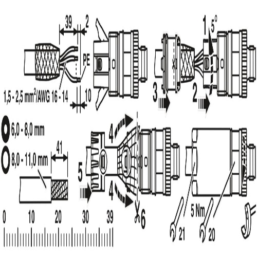 Phoenix Contact 1080220 The power connector is a 4-position shielded plug with an M12 straight thread and features a push-lock spring connection, made from brass nickel-plated material, featuring an external cable diameter ranging from 6 to 11 millimeters with four contact leads.