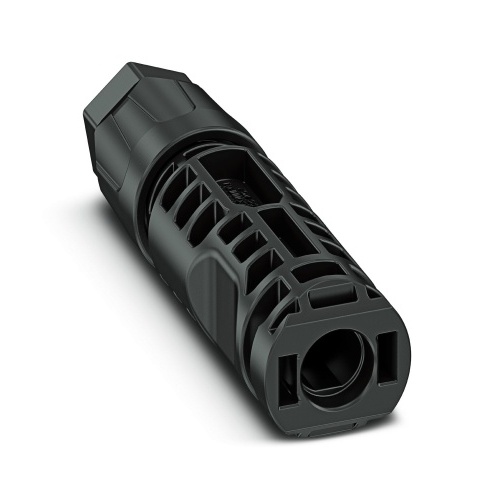 Phoenix Contact 1050770 The photovoltaic connector features a black color and has one position available for articles with varying conductor cross-sections between 2.5mm² and 6mm², supporting up to 40A of current at a maximum rated voltage of 1500V DC. It uses a crimp connection method and has pin contact connections, accommodating cables with diameters ranging from 5mm to 8mm in diameter.