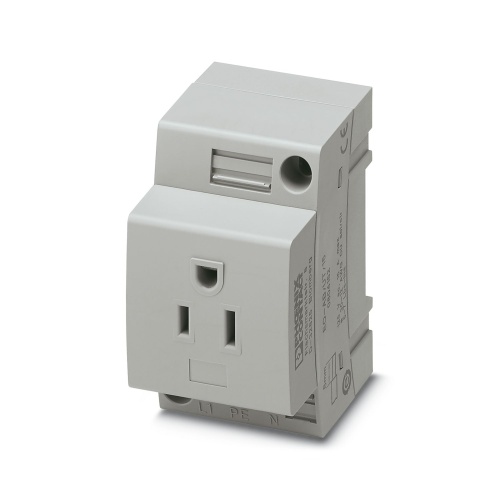 Phoenix Contact 0804152 The socket, suitable for use in the US and other countries, has a pin connector pattern type AB 15A, employing a screw connection and featuring a gray color. It operates within a 125 V AC (60 Hz) nominal voltage range and draws up to 15 A of current, making it versatile for installation on either a DIN rail or direct mounting. Compliance with the UL 508 standard is ensured, while the country of origin is marked as USA.