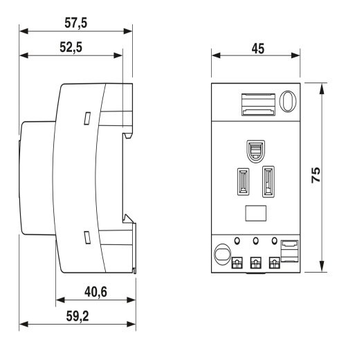 Phoenix Contact 0804165 In countries like the USA and others, this type of socket features a Pin connector pattern type AB 15A with a push-in spring connection, typically colored gray. It operates within specified limits of 125 V AC (60 Hz) and has a maximum current capacity of 15 A. This socket can be mounted on either a DIN rail in the service interface or directly attached to a surface, adhering to standards such as UL 508 and IEC 60884-1. The product is marked for use exclusively in the USA.
