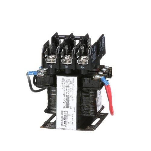 Square D 9070TF50D1 Class 9070 Type TF Transformer 50 VA Output (VACAmp). 240/480 VAC to 120 VAC OR 230/460 VAC to 115 VAC OR 220/440 VAC to 110 VAC. 4" x 3" x 3.09" (HxWxD). Includes 2 primary fuse blocks and 1 secondary fuse block mounted on top of transformer. Includes rejection-style clips to increase the AIC ratings for the fuses. Low impedance windings for excellent VACage regulation. Accomodates high inrush currents from relays, starters, solenoids, contactors etc.