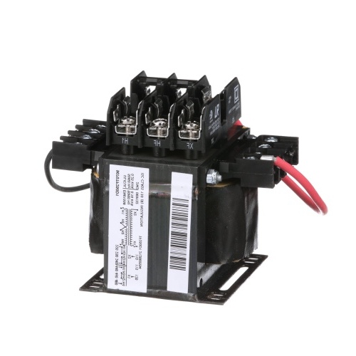 Square D 9070TF250D1 Class 9070 Type TF Transformer 250 VA Output (VACAmp). 240/480 VAC to 120 VAC OR 230/460 VAC to 115 VAC OR 220/440 VAC to 110 VAC. 4.5" x 3.75" x 5.3" (HxWxD). Includes 2 primary fuse blocks and 1 secondary fuse block mounted on top of transformer. Includes rejection-style clips to increase the AIC ratings for the fuses. Low impedance windings for excellent VACage regulation. Accomodates high inrush currents from relays, starters, solenoids, contactors etc.