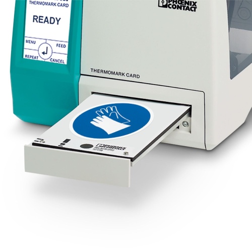 Phoenix Contact 1014177 A mandatory sign card featuring a blue and white design can be purchased without a label or with one of the specified THERMOMARK branding options. The card itself has an adhesive mounting type, measuring 100mm in diameter, and includes space for a single line of text with dimensions of 100mm height and width.