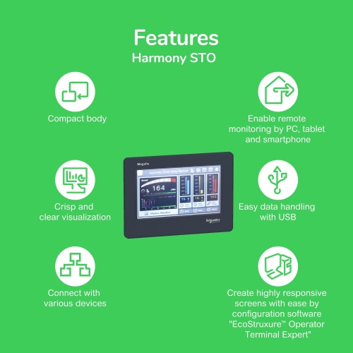 Schneider Electric HMISTO715 4.3 inch HMI Screen is designed to be a compact, cost effective solution for machine builders. This HMI screen has 7.5 Watts of max power consumption at 12 VDC-24 VDC, a Full Color Touch Screen Interface with a display resolution of 480 x 272 pixels. This HMI Screen is UL 61010 certified and is mounted with a 2 Fastener mount to panel and includes 3 connection types: 1 RJ45 RS232C/RS485, 1 USB 2.0 type mini B and 1 USB 2.0 type A. (REQUIRES Vijeo XD TO CONFIGURE. SOLD SEPARATLY)