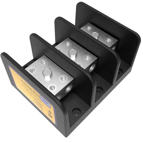 Ilsco PDB-22-2/0-3 - Power Distribution Block for 3 poles with 2 ports per pole on line and load sides. Dual rated for 2/0-14 line and load conductors. Made of black aluminum with tin finish connectors. UL 1059 recognized, 600V voltage rating, and 620A amperage rating. Mounts with #10 bolts, spacing of 3.375 inches.