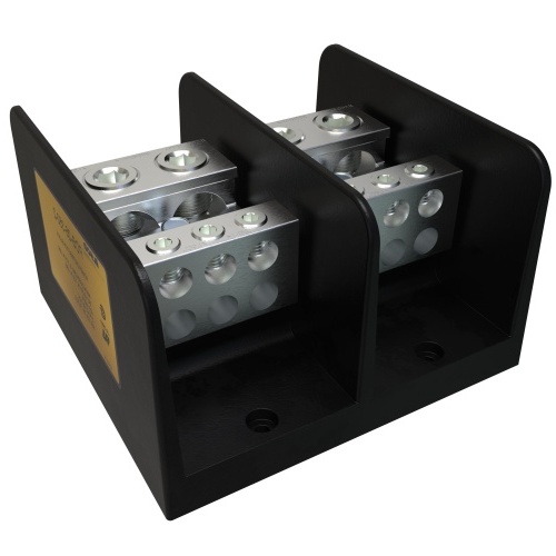 Ilsco PDB-26-500-2 - A dual-rated Power Distribution Block with 2 poles, 2 ports per pole on the line side, and 6 ports per pole on the load side. Constructed of black aluminum with tin connector finish. UL/CSA approved for 600V, 90°C. Suitable for solid and stranded copper/aluminum conductors ranging from 500 kcmil to 14 Sol/Str. Mounting holes for 1/4 bolts, accommodating up to 8 conductors. Ideal for mechanical connections in industrial settings. Amperage rated at 760 Amps. Enclosure made of Valox. NEMA Code S-588-4, CSA File Number LR-29601. Meets UL 1059 Recognized, CSA C22.2 No. 65-03 standards.