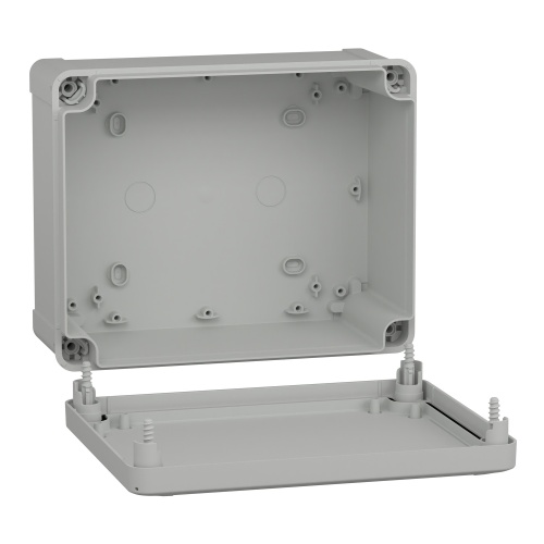 Schneider Electric Thalassa TBP is a wall-mounted enclosure suitable for outdoor use (with canopy or shelter). Its polycarbonate construction provides durability and electrical insulation (Class II). The gray RAL 7035 color fits seamlessly in various settings. With a low plain cover, captive screw locks, and removable parts, it ensures easy access and secure protection. Operating at temperatures from -13 to 176 °F (-25 to 80 °C) and with a fire resistance of 1760 °F (960 °C), this enclosure guarantees reliable performance. Internal dimensions measure 6.89 x 8.86 x 3.94 in (175 x 225 x 100 mm).