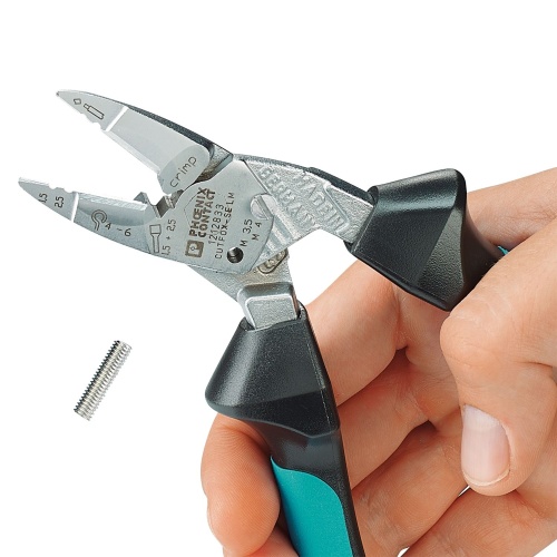 Phoenix Contact 1212833 The electrician's tool features an angular cut made by its diagonal edge, a distinctive design element that also houses stripping and crimping areas, and measures 180 millimeters in length.