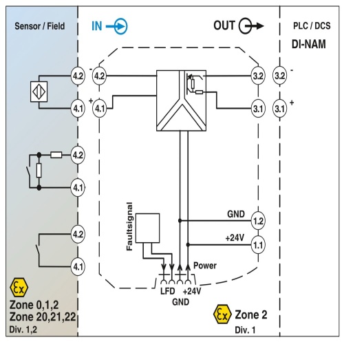 for NAMUR proximity sensors (EN 60947-5-6) or switch contacts