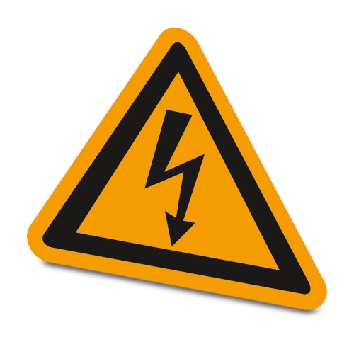 Phoenix Contact 0830434 A warning label with a lightning flash symbol on a sheet with a yellow and black color scheme has nine individual labels, each measuring 50mm in both height and width, attached to the sheet using an adhesive mounting type.