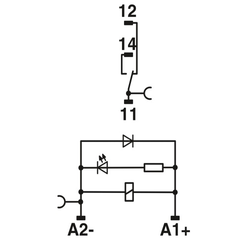 Phoenix Contact 1550107 A pre-assembled relay module features a push-in connection, comprising a relay base with an ejector and a plug-in miniature relay that includes a power contact and manual override. The relay switch is of the contact type, utilizing one changeover contact for its switching function, while operating within an input voltage range of 24 DC volts.